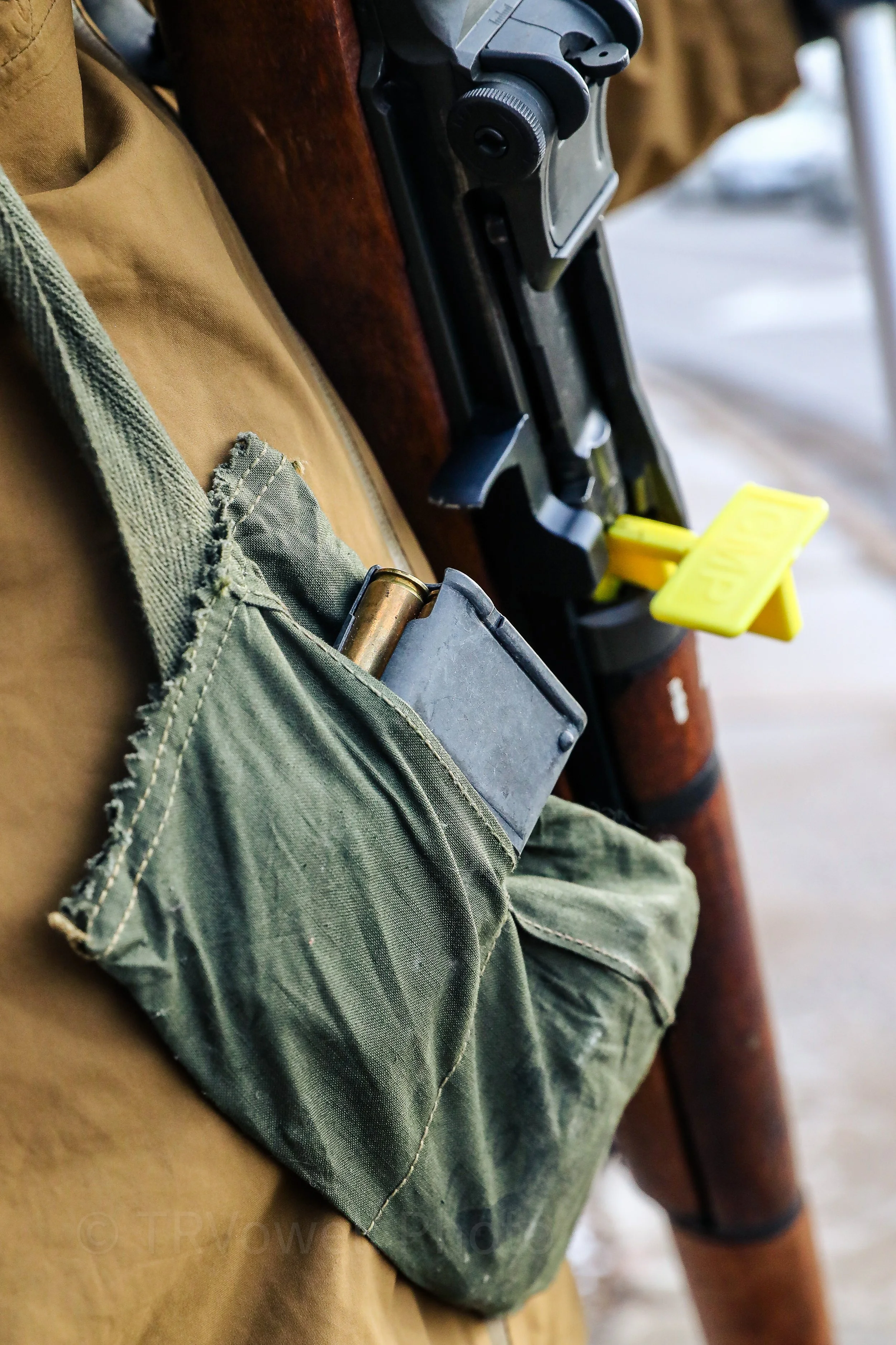 With a yellow chamber-flag (a safety device that indicates a firearm is unloaded) in his 80+ year old Garand, Michael stated that he chose to carry the weapon empty because he did not want to scare or intimidate any of the motorist.
