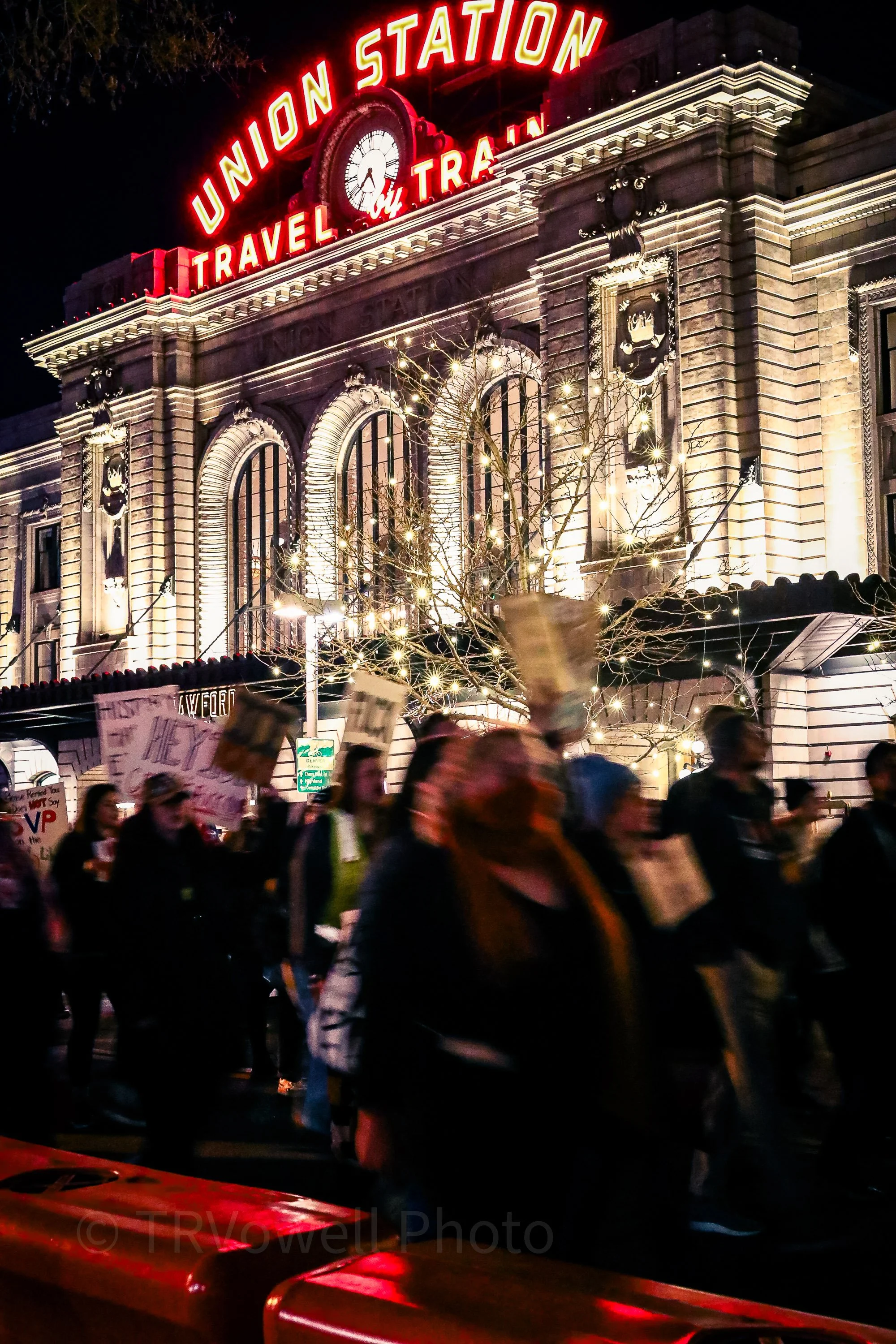 The protesters marched through the streets, twisting and turning through the turns, The protesters were loud and persistent. Drums, megaphones, an instrument that I could not identify, loud-speakers, and the voices of the people shouted and demanded to be heard by the denizens of Denver.